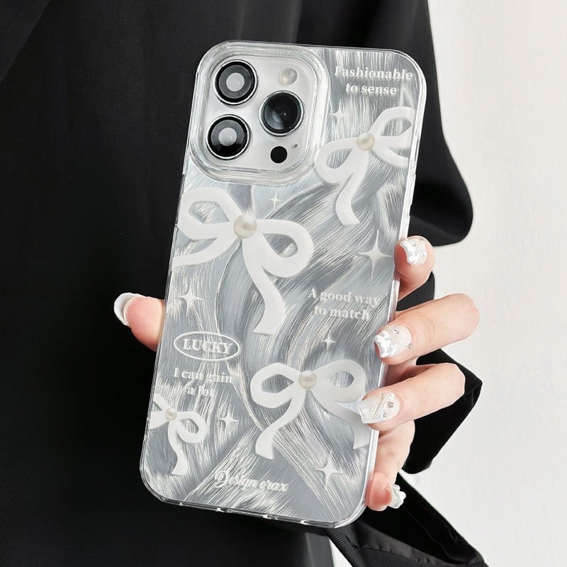 iPhone スマホケース iPhone 17 Air 16 15 14 13 12 Pro Max アートレーザー風 反射フェザー×パールリボンデザイン保護ケース