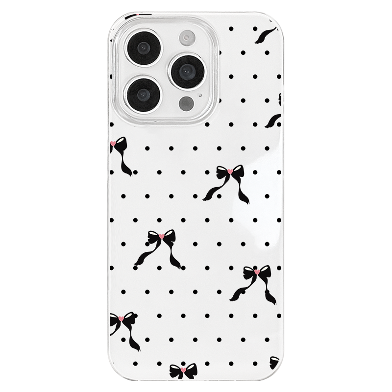 iPhone 17 16e 15 14 Plus 13 12 11 Pro Max スマホケース かわいい黒のリボンと水玉柄 パターン印刷二重層IMDホワイトスマホケース