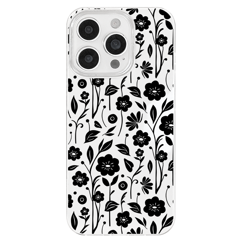 iPhone 17 16e 15 14 Plus 13 12 11 Pro Max スマホケース ヴィンテージの黒い花と葉柄 パターン印刷二重層IMDホワイトスマホケース