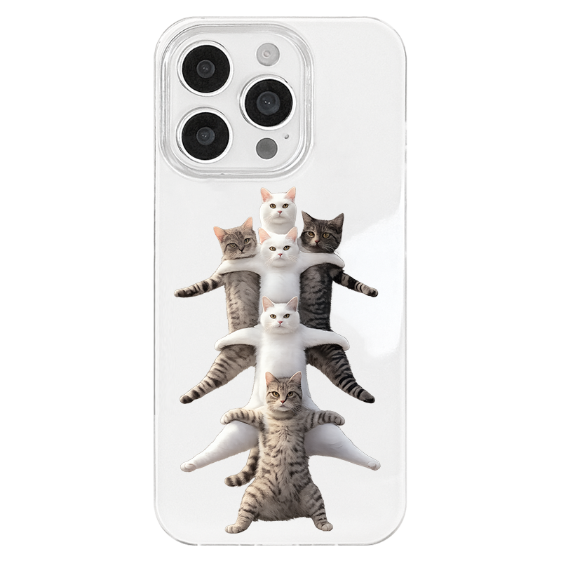 iPhone 17 16e 15 14 Plus 13 12 11 Pro Max スマホケース かわいい猫と面白い猫が積み重なっていパターン印刷二重層IMDホワイトスマホケース