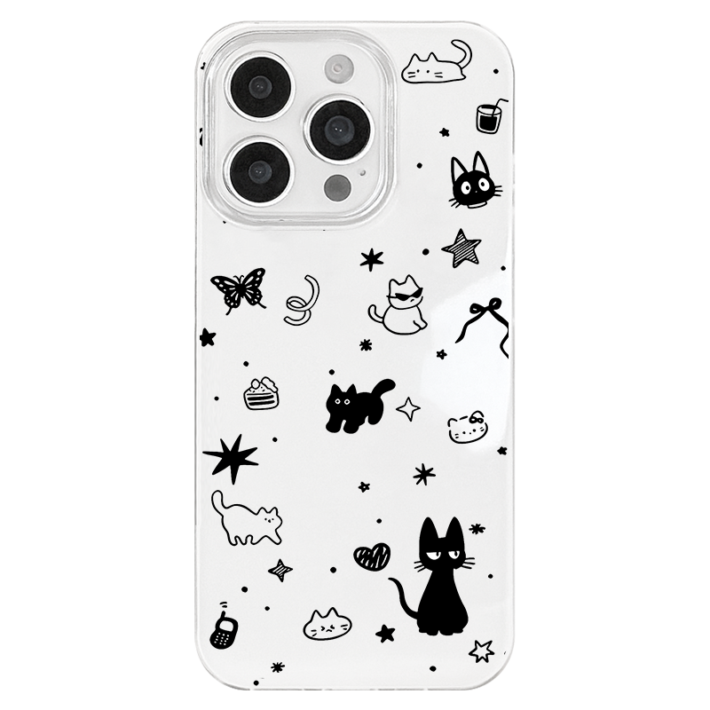 iPhone 17 16e 15 14 Plus 13 12 11 Pro Max スマホケース かわいくて楽しい黒猫のパターン印刷二重層IMDホワイトスマホケース