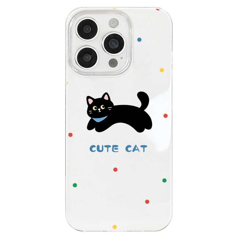 iPhone 17 16e 15 14 Plus 13 12 11 Pro Max スマホケース カラフルな水玉模様のかわいい黒猫パターン印刷二重層IMDホワイトスマホケース