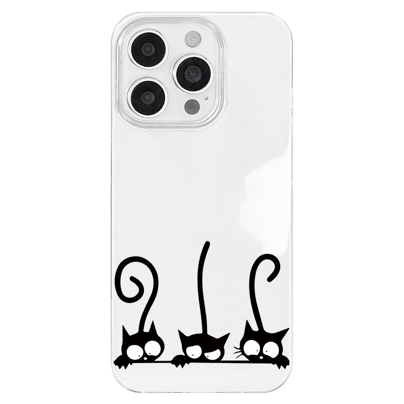 iPhone 17 16e 15 14 Plus 13 12 11 Pro Max スマホケース 3匹の黒猫を興味深く覗き見るパターン印刷二重層IMDホワイトスマホケース