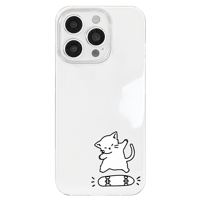 iPhone 17 16e 15 14 Plus 13 12 11 Pro Max スマホケース かわいくて楽しいスケートボードで遊ぶ白い猫パターン印刷二重層IMDホワイトスマホケース