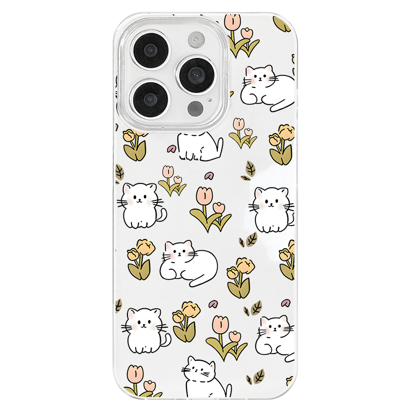 iPhone 17 16e 15 14 Plus 13 12 11 Pro Max スマホケース かわいい白い猫と花柄のパターン印刷二重層IMDホワイトスマホケース
