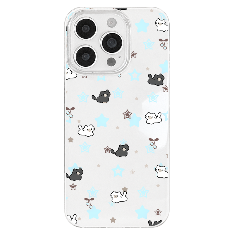 iPhone 17 16e 15 14 Plus 13 12 11 Pro Max スマホケース かわいい癒しの黒猫と星柄のパターン印刷二重層IMDホワイトスマホケース
