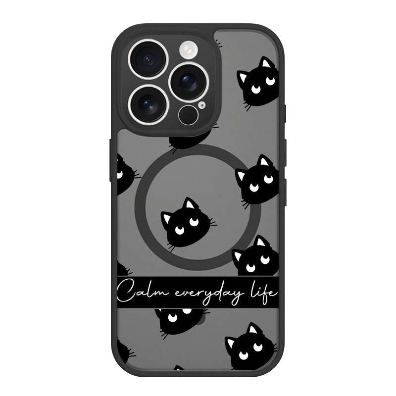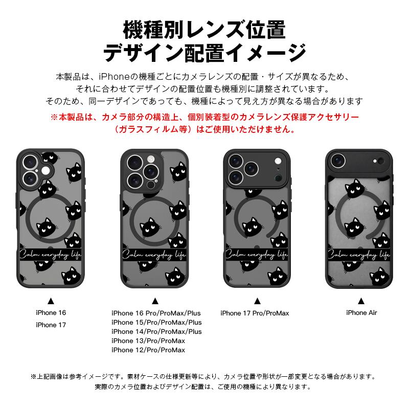 iPhone 17 Air 16 15 Plus 14 13 12 Pro Max スマホケース ゆる可愛い黒猫散りばめ総柄 プリントデザイン半透明ブラックマット仕上げMagSafe対応スマホケース