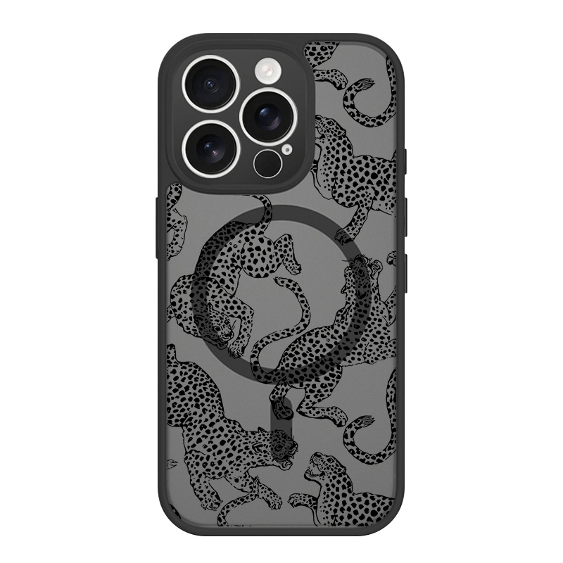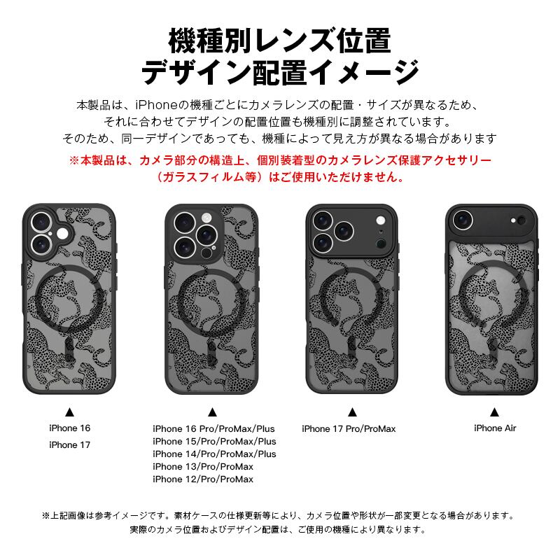iPhone 17 Air 16 15 Plus 14 13 12 Pro Max スマホケース アート感のある豹シルエット総柄 プリントデザイン半透明ブラックマット仕上げMagSafe対応スマホケース