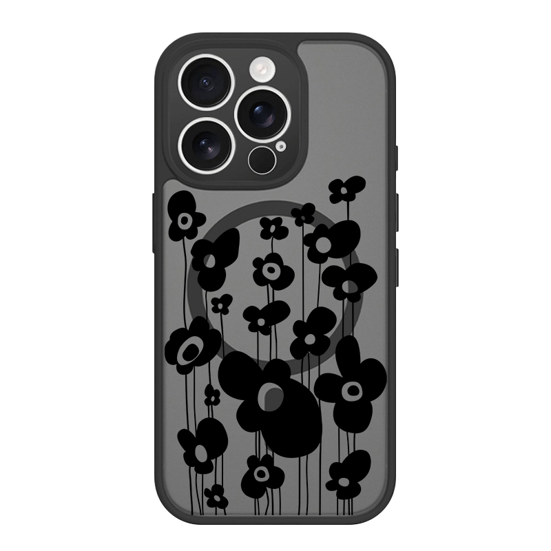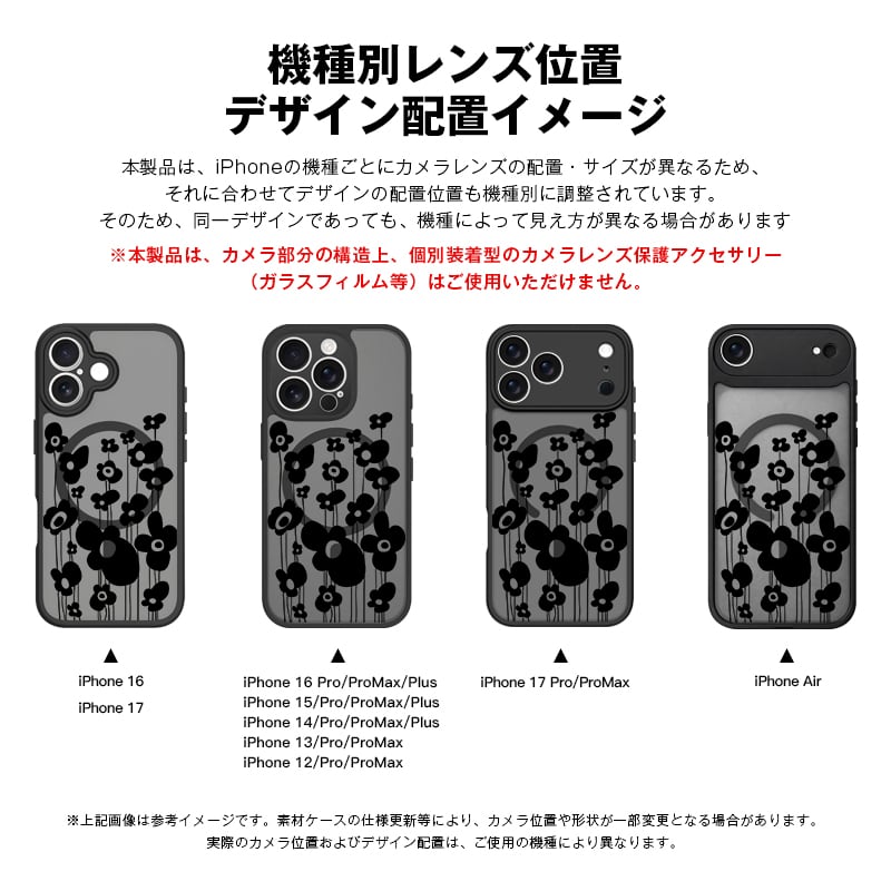 iPhone 17 Air 16 15 Plus 14 13 12 Pro Max スマホケース 大人可愛いフラワーシルエット柄 プリントデザイン半透明ブラックマット仕上げMagSafe対応スマホケース