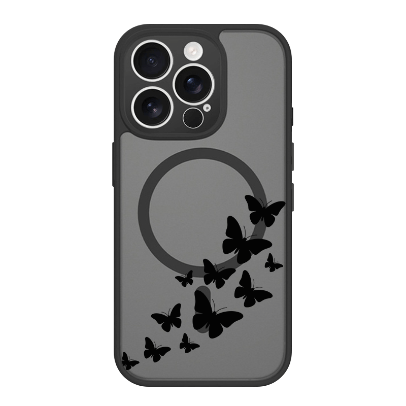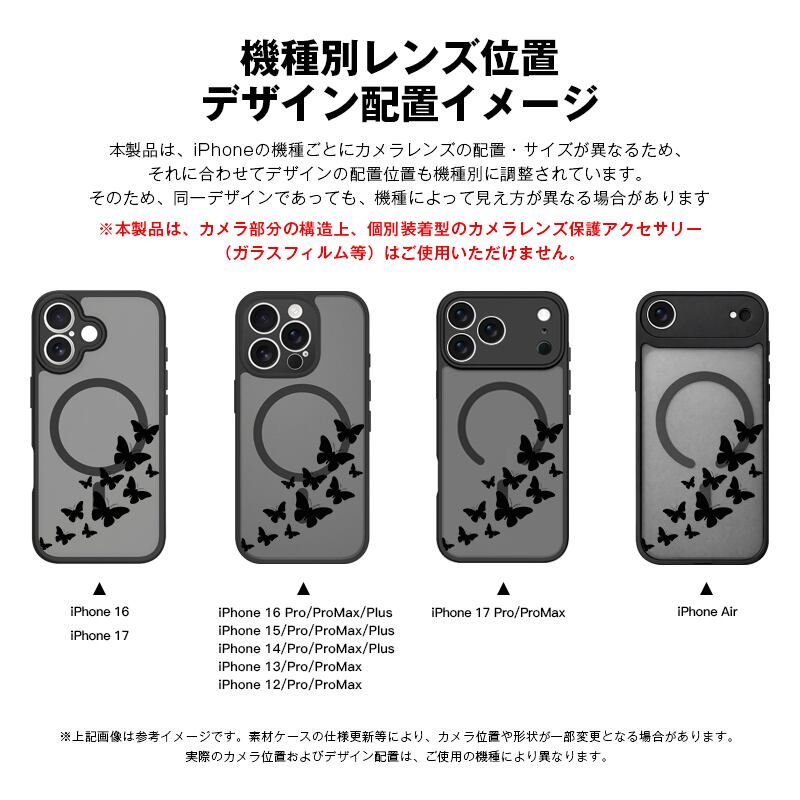 iPhone 17 Air 16 15 Plus 14 13 12 Pro Max スマホケース シンプルでおしゃれなフライトバタフライ柄 プリントデザイン半透明ブラックマット仕上げMagSafe対応スマホケース