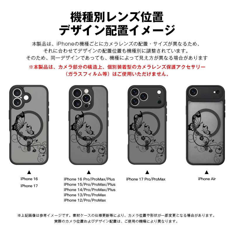 iPhone 17 Air 16 15 Plus 14 13 12 Pro Max スマホケース 繊細で可愛いフローラルバタフライ柄 プリントデザイン半透明ブラックマット仕上げMagSafe対応スマホケース