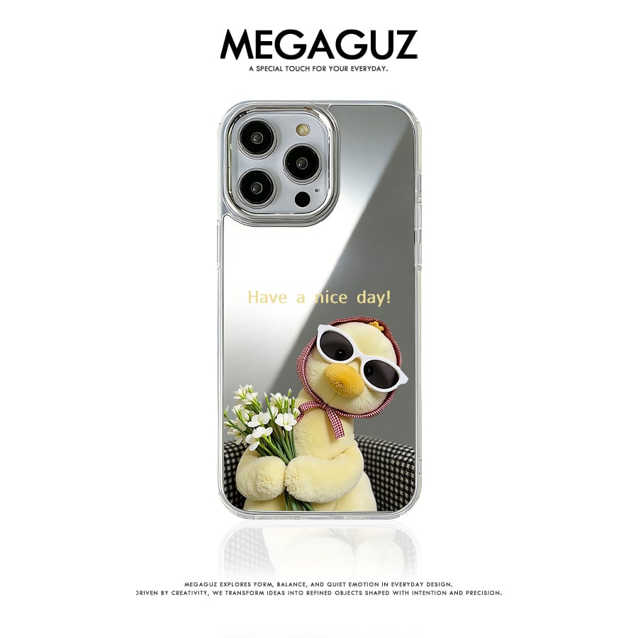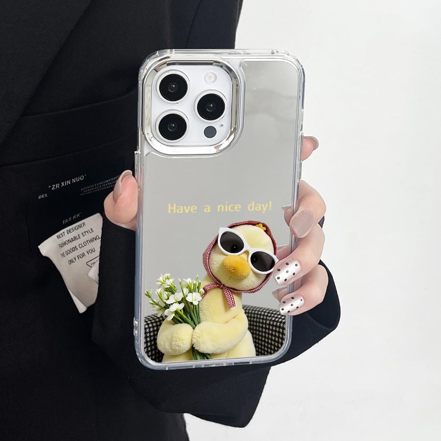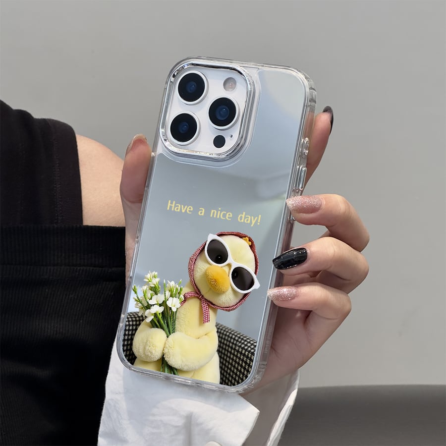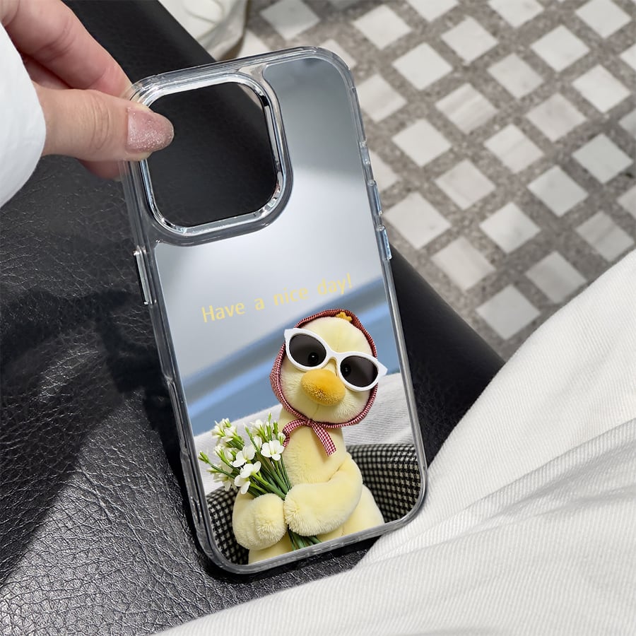 【国内発送】お花を抱えたニコニコあひるさんデザインプリント iPhone 17 16 15 14 13 12 Pro Max スマホケース iphone 17e 16eケース 大人可愛い光沢鏡面アクリル背面ミラーケース