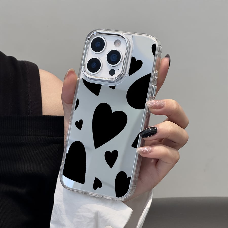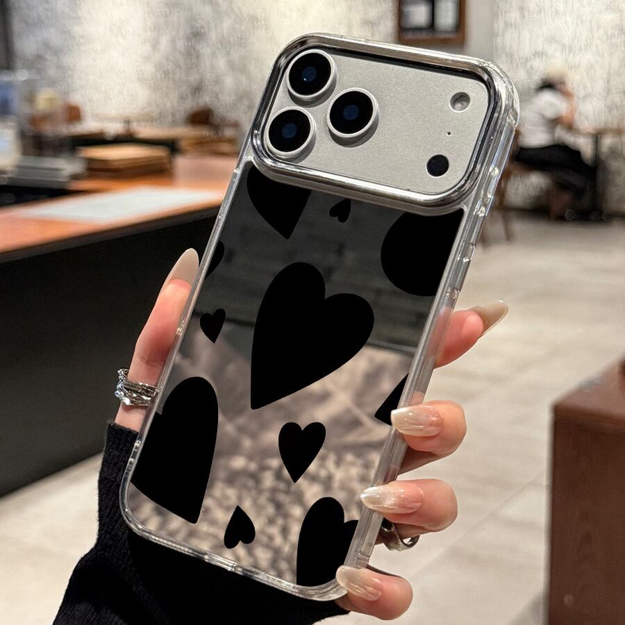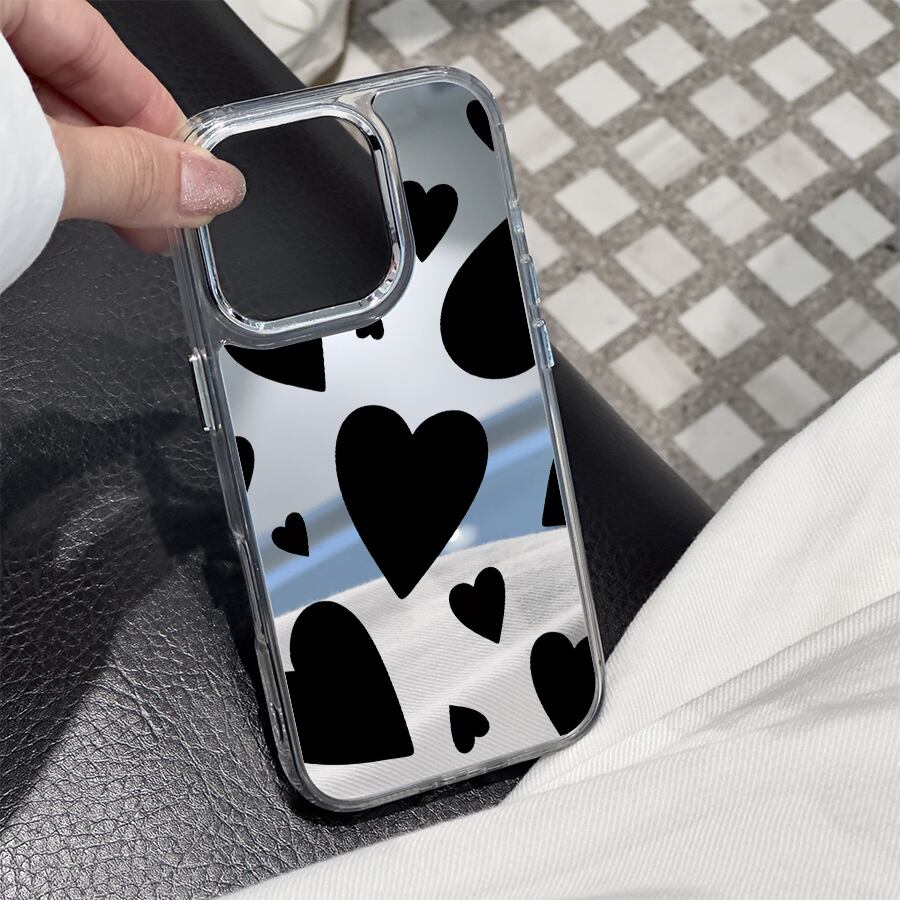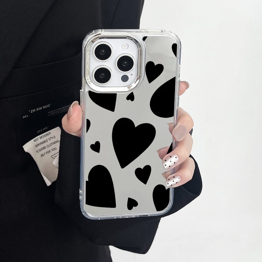 【国内発送】大人女子のモノトーン大きなハートデザインプリント iPhone 17 16 15 14 13 12 Pro Max スマホケース iphone 17e 16eケース 大人可愛い光沢鏡面アクリル背面ミラーケース