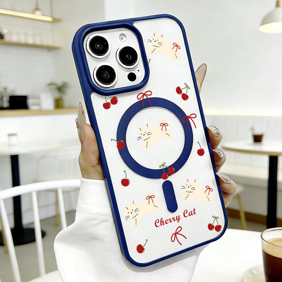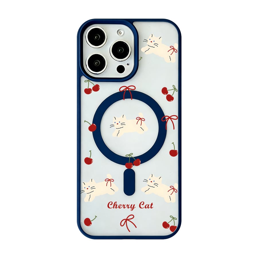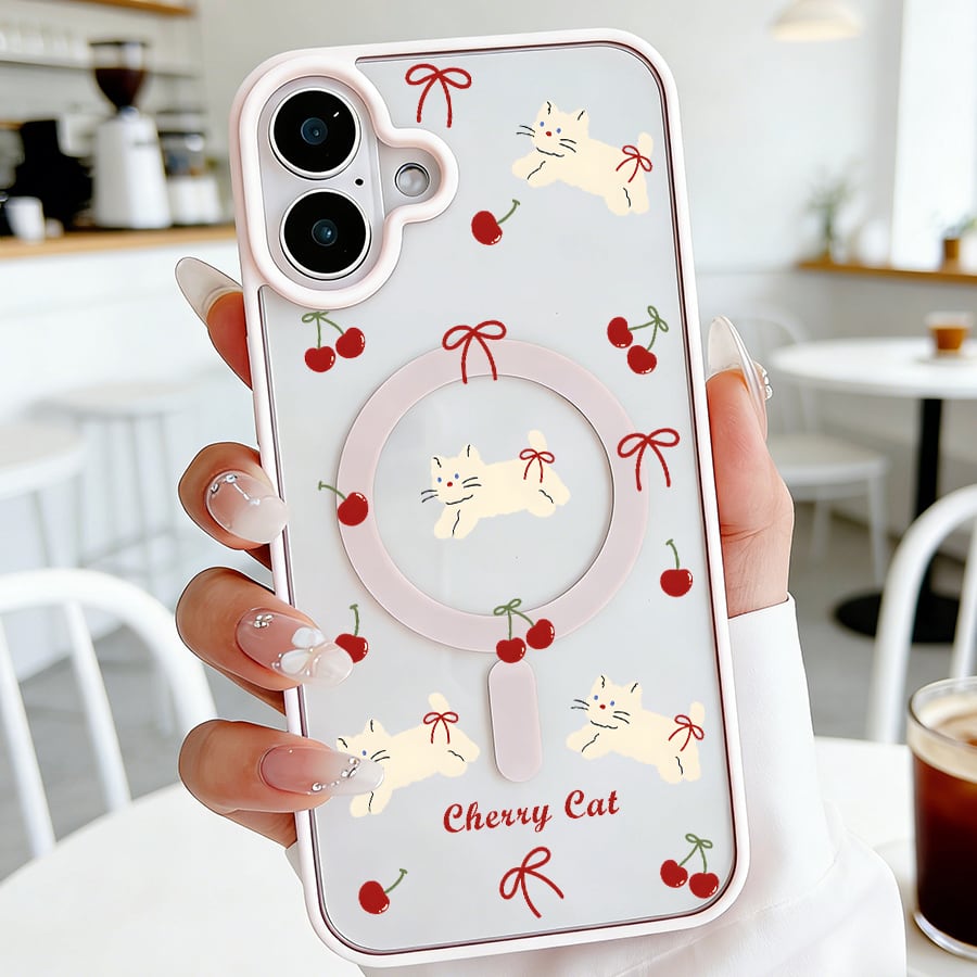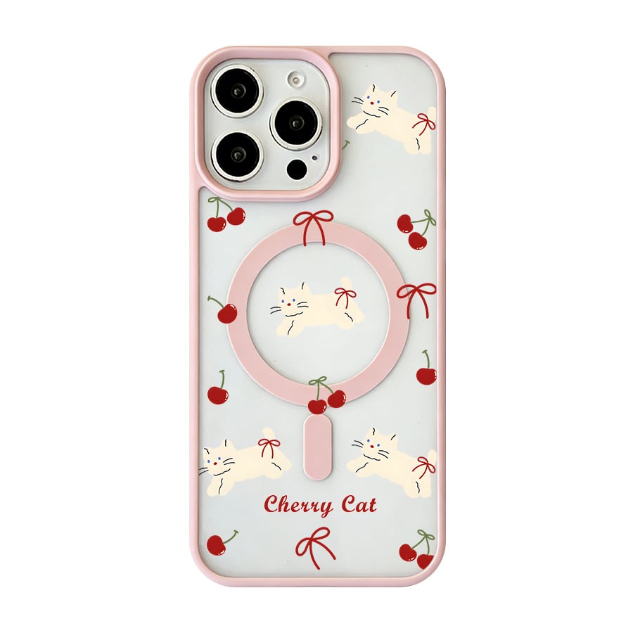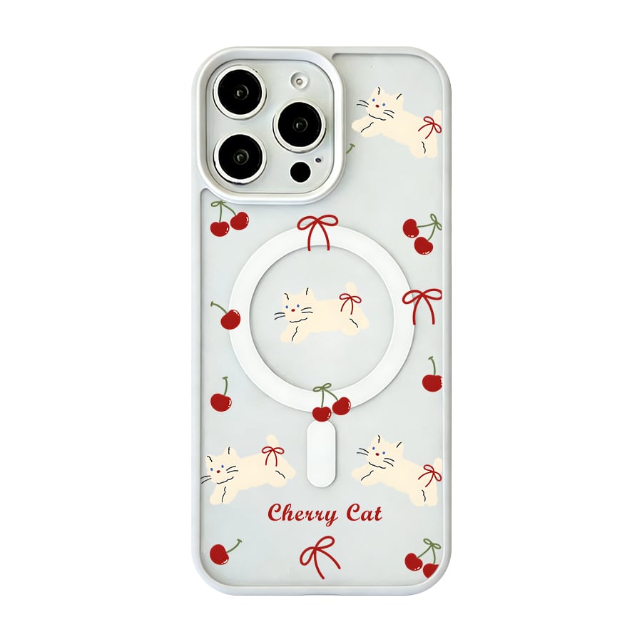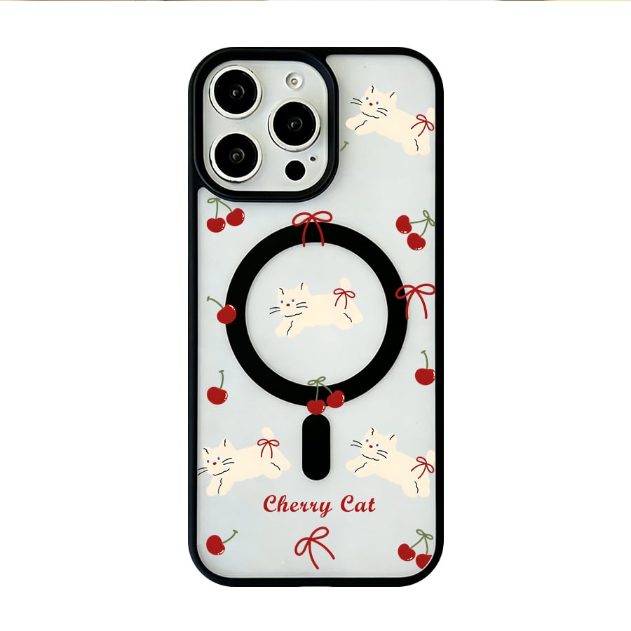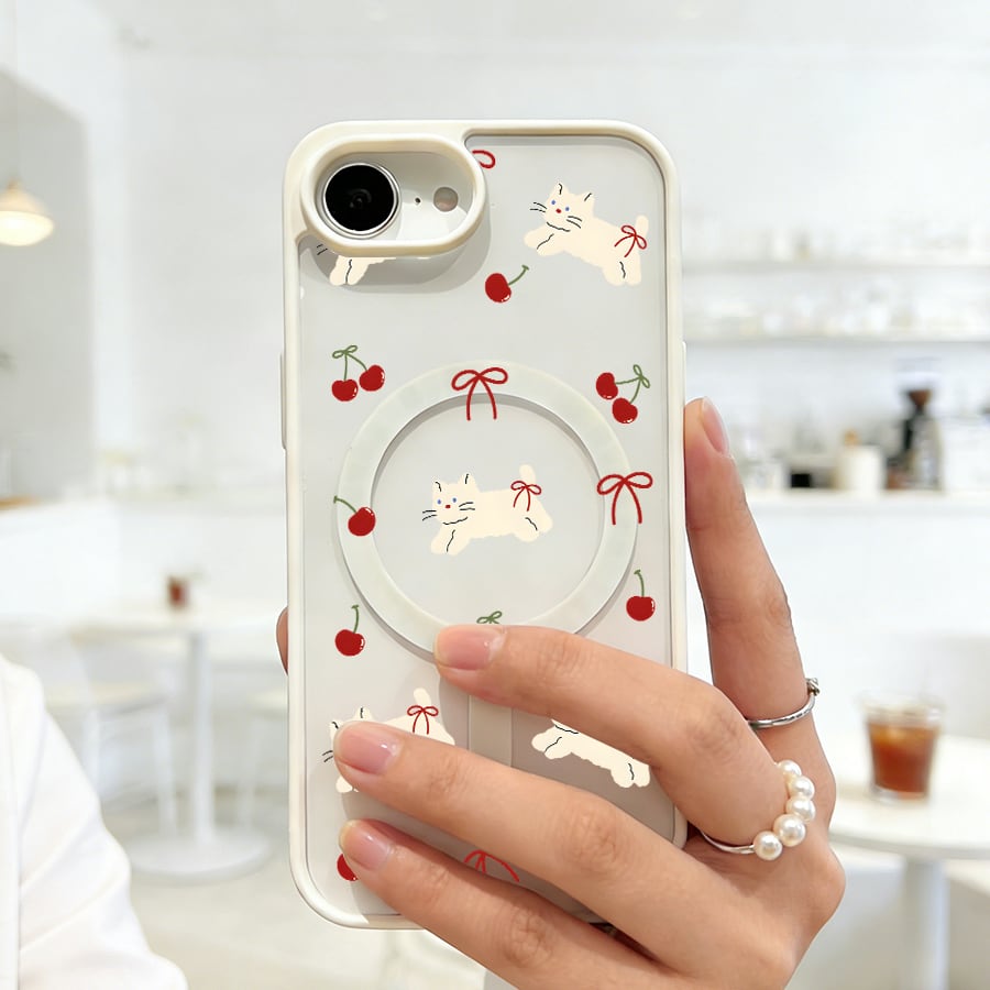 iPhone 17 16 15 14 13 12 Pro Max スマホケース iPhone 17e/16eケース チェリー付きポップねこ柄デザインプリントケース 可愛いシンプル軽量薄型カラーフレームMagsafeケース